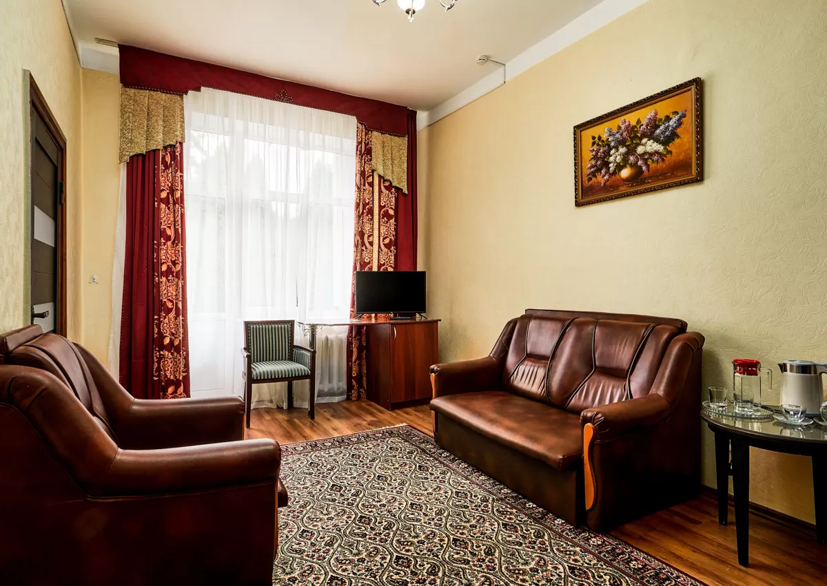 Стильный Двухместный двухкомнатный номер санатория «Кирова» в Кисловодске сочетает в себе сдержанный стиль дизайна интерьера и комфортные условия проживания. Номер включает в себя две комнаты и санузел общей площадью 15-20 кв. метров. Здесь могут с комфортом разместиться 2-3 человека.