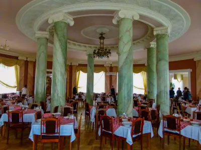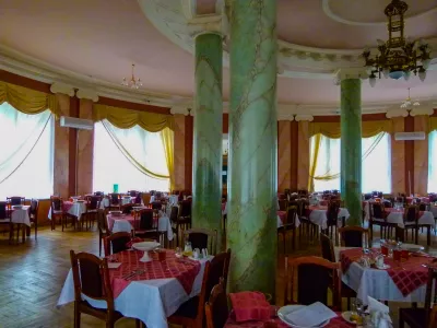 Столовая санатория имени Кирова – это не только место, где гости могут насладиться вкусными и полезными блюдами, но и настоящий оазис комфорта и уюта. Великолепный круглый зал с мраморными колоннами вмещает до 140 посадочных мест, создавая атмосферу приятного общения и отдыха.